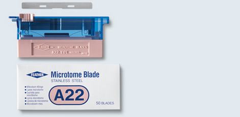 The A22 disposable microtome blade allows the production of very thin sections in routine use and research and is suitable for fibrous tissues (biopsies/fabrics) and also for ribbon sectioning after trimming.